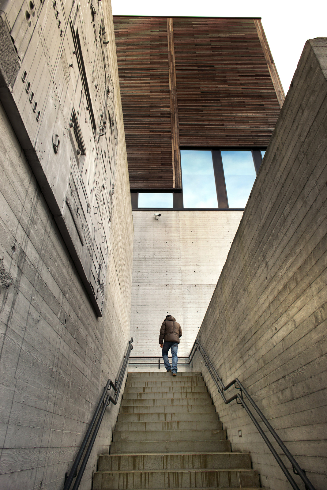 – Det ville blitt en stor utfordring om vi til stadighet måtte male eller olje kledningen. Fargen på termoasken gjør at bygget fremstår som helhetlig i overgangen mellom betong, glass og tre. Vi følger spent med på hvordan fargen endrer seg med tiden – i begynnelsen var den mørk rødbrun, men nå har den blitt lysere, og slik jeg forstår det vil den ende opp i en sølvgrå tone, sier Masdalen, som også har lagt merke til at fargen skifter med vær og vind.