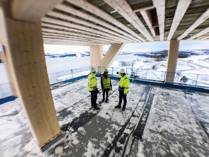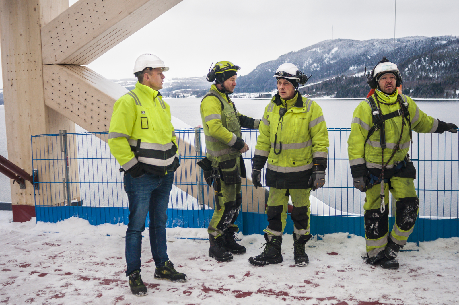 Abrahamsen ser oppover mot den foreløpige toppen av Mjøstårnet på 52 meter. Han sier at for Moelven Limtre er Mjøstårnet i teknologisk forstand en oppreist trebru. Abrahamsen står sammen med de rådgivende ingeniørene Magne Aanstad Bjertnæs og Alvdis Hardeng fra samarbeidspartneren Sweco.