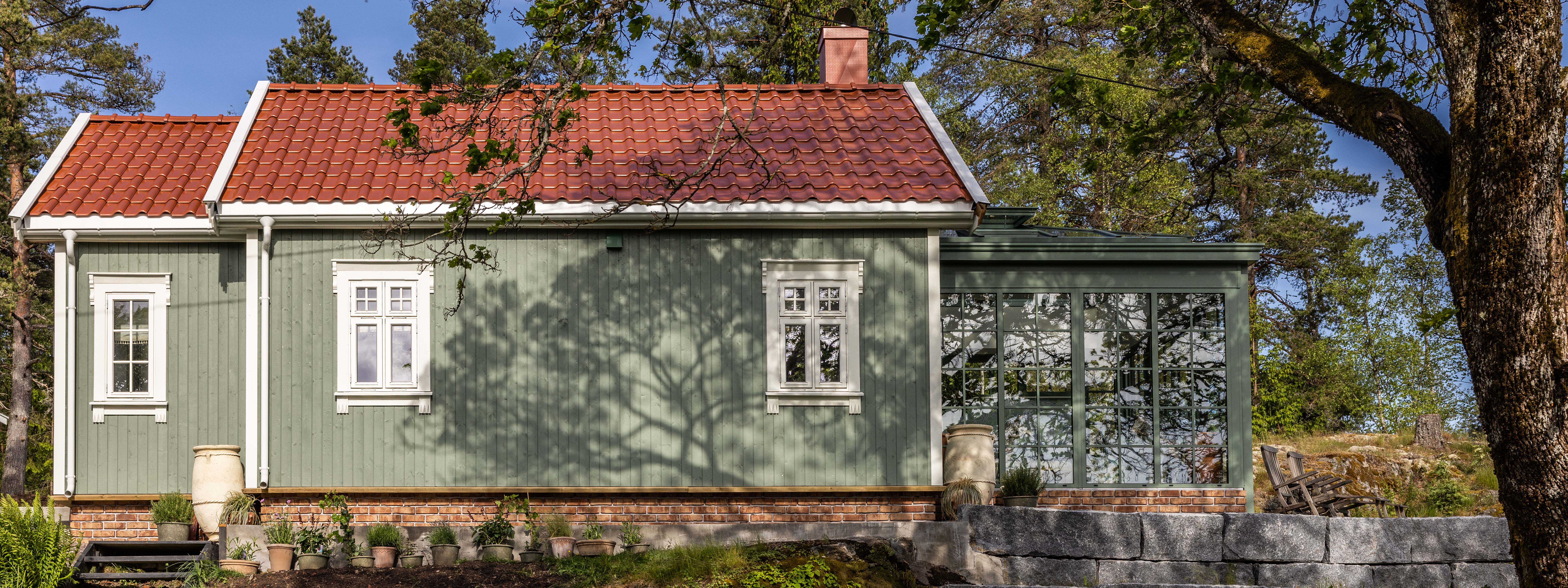 Fasaden er kledd med Heftig PRO+ Dobbelfals 5 mm fra Moelven – ferdig grunnet og malt på fabrikk i den dempede fargen Stockholmsgrønn. Kontrastene skapes av detaljer i fargen Tidløs hvit, som gir et rent, klassisk uttrykk.