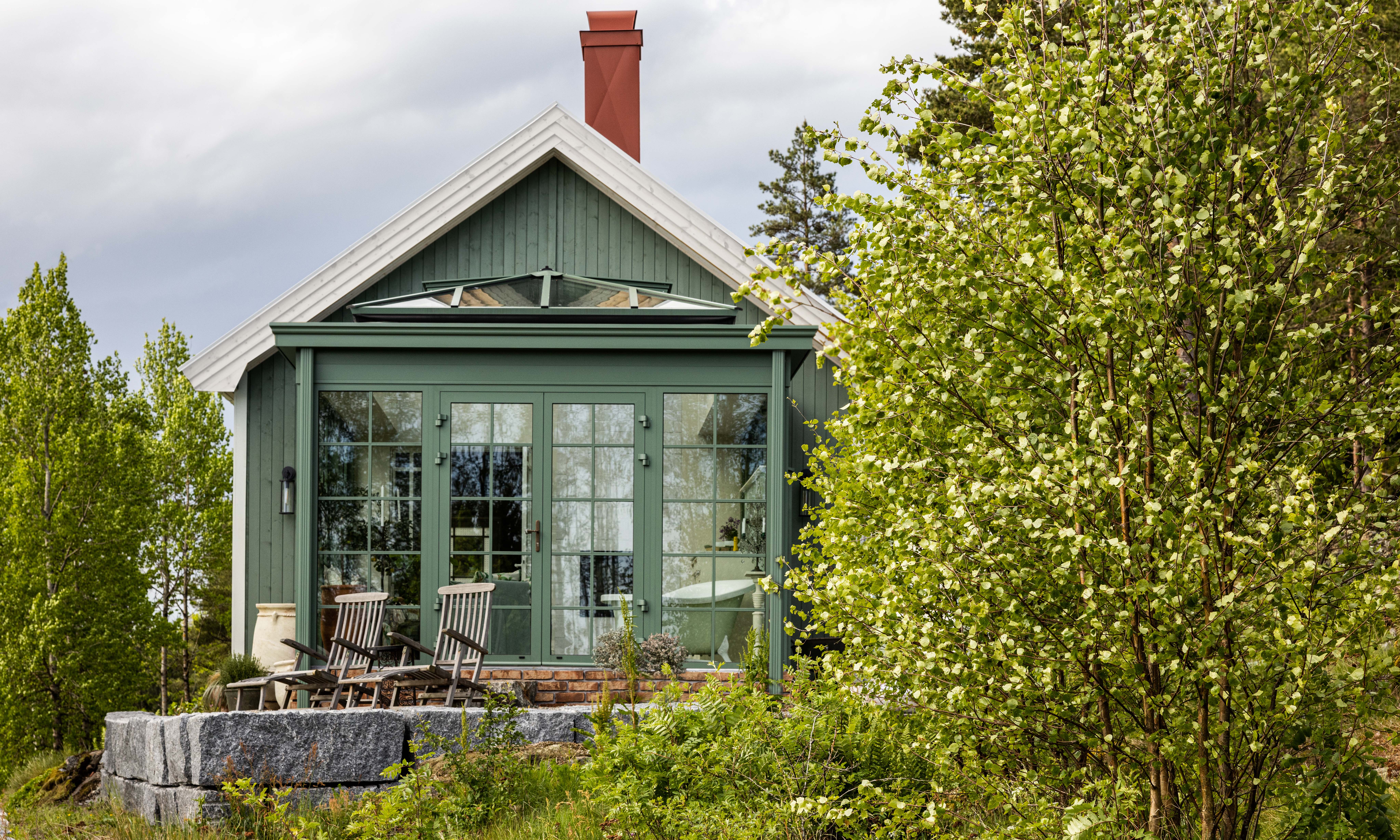 Den grønne kledningen mot hvite detaljer gir huset et naturlig, moderne og tidløst preg – perfekt tilpasset den norske naturen rundt. Kombinasjonen av Jotuns farger og Moelvens Heftig-kledning viser hvordan små bygg kan bli store på uttrykk.