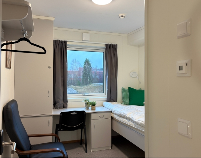 Boligriggen inneholder 24 hybler fordelt på to etasjer, alle med eget bad.