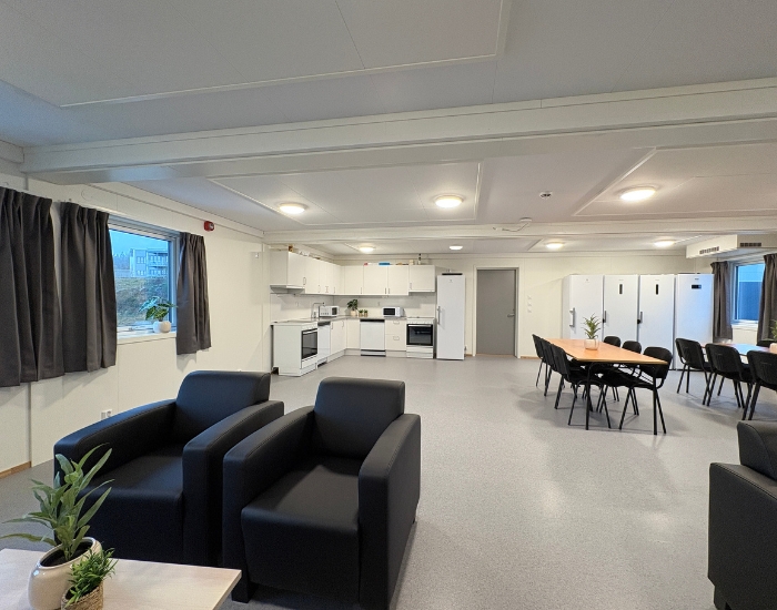 Andre etasje har et stort fellesområde på drøyt 68 kvm som består av kjøkkenkrok, spiseplasser, sittegrupper og TV – et sted for rekreasjon og avslapning etter arbeidsdagen.