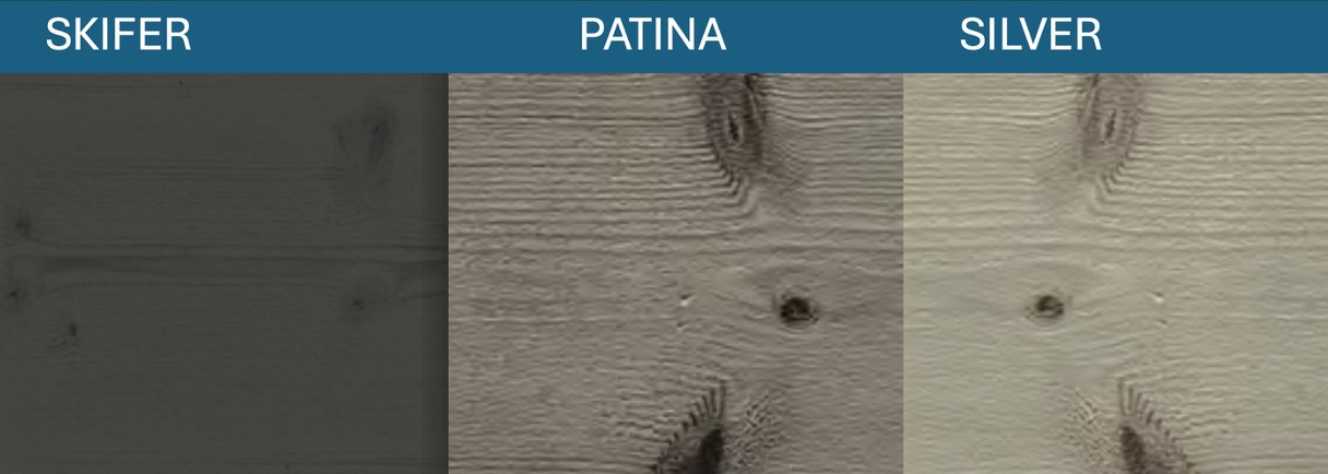 Innfargingen leveres i følgende farger: Skifer, Patina og Silver (andre farger er mulig men dette kan bety vedlikehold) For et mest mulig naturlig utseende anbefaler vi å velge silver.