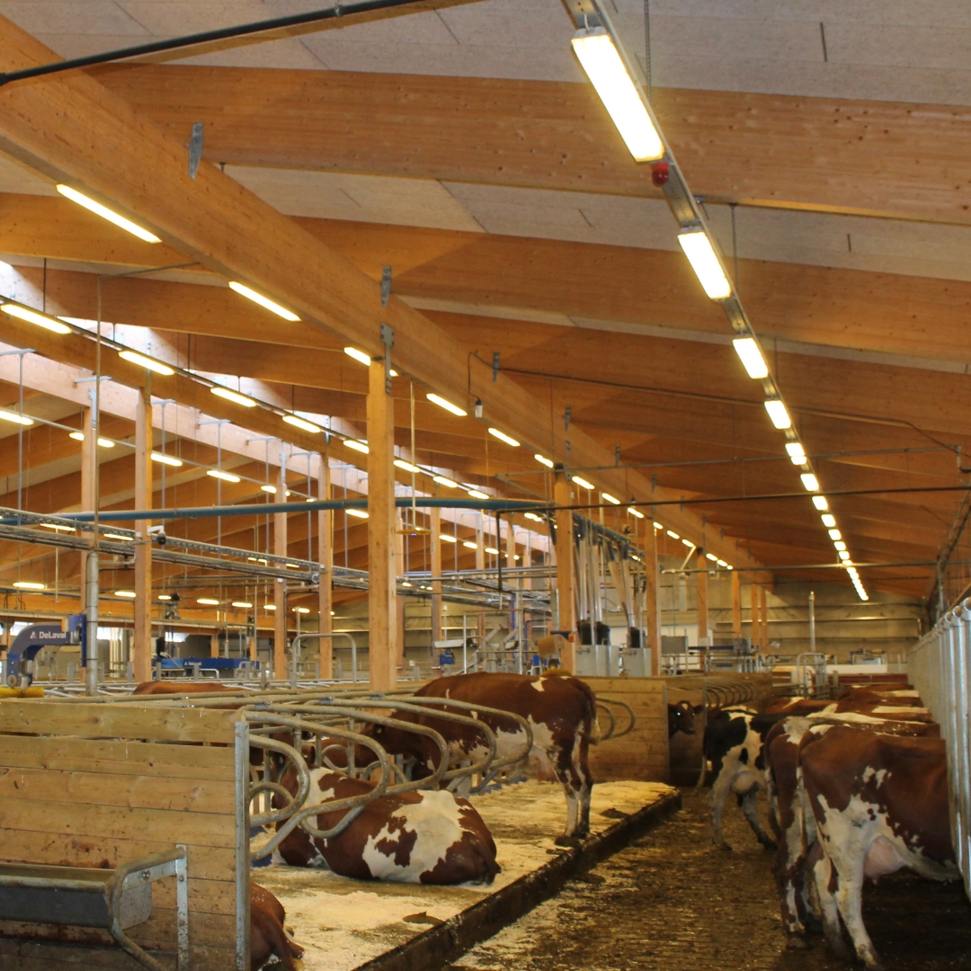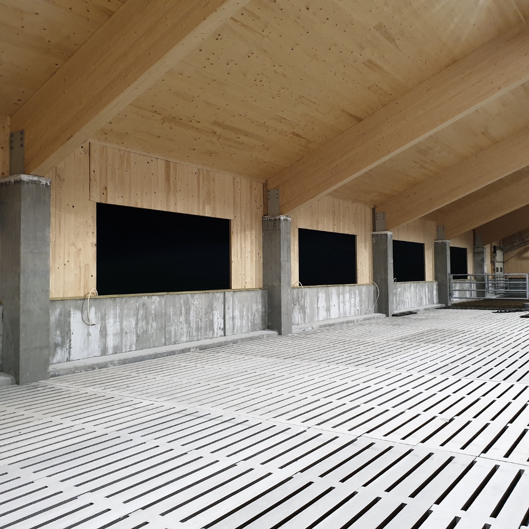 Store og lyse treoverflater i landbruksbygg kan dempe støy fra maskiner, samt gi et stabilt og godt inneklima.