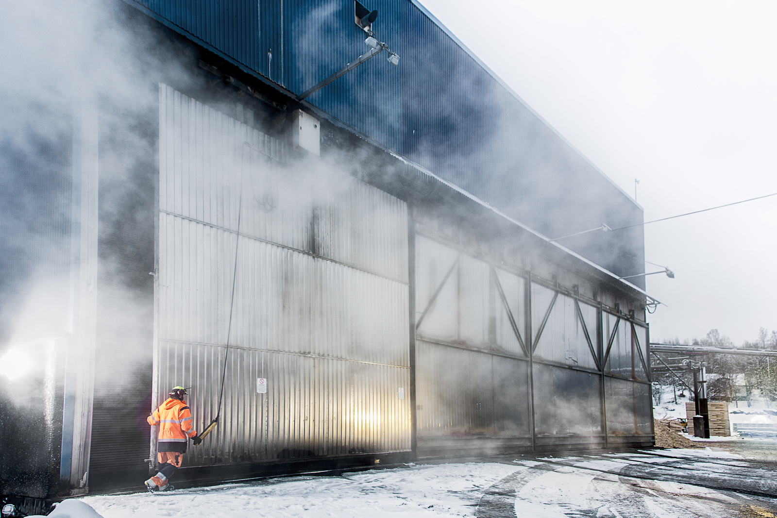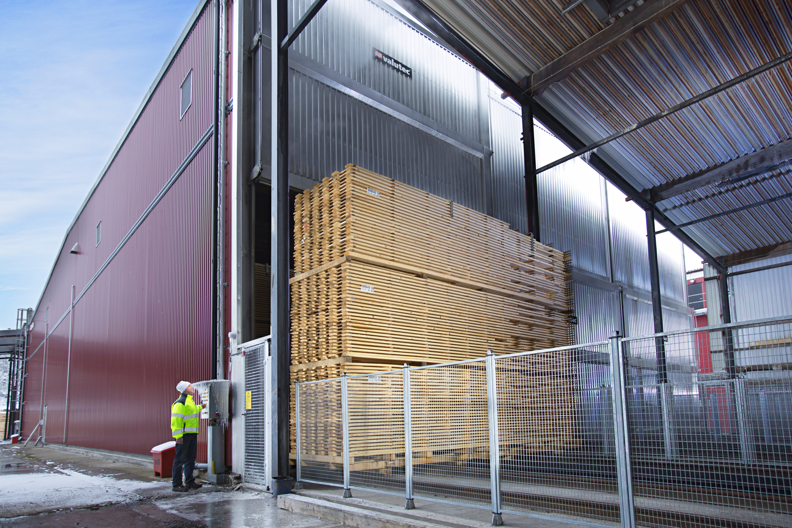 Temperatur som i en bastu och fångad i en stormvind. Noggrannhet och noga uppföljning av processen. Precisionsnivån är hög när Moelven minskar fukthalten i träet till exakt den nivå som varje enskild kund vill ha.