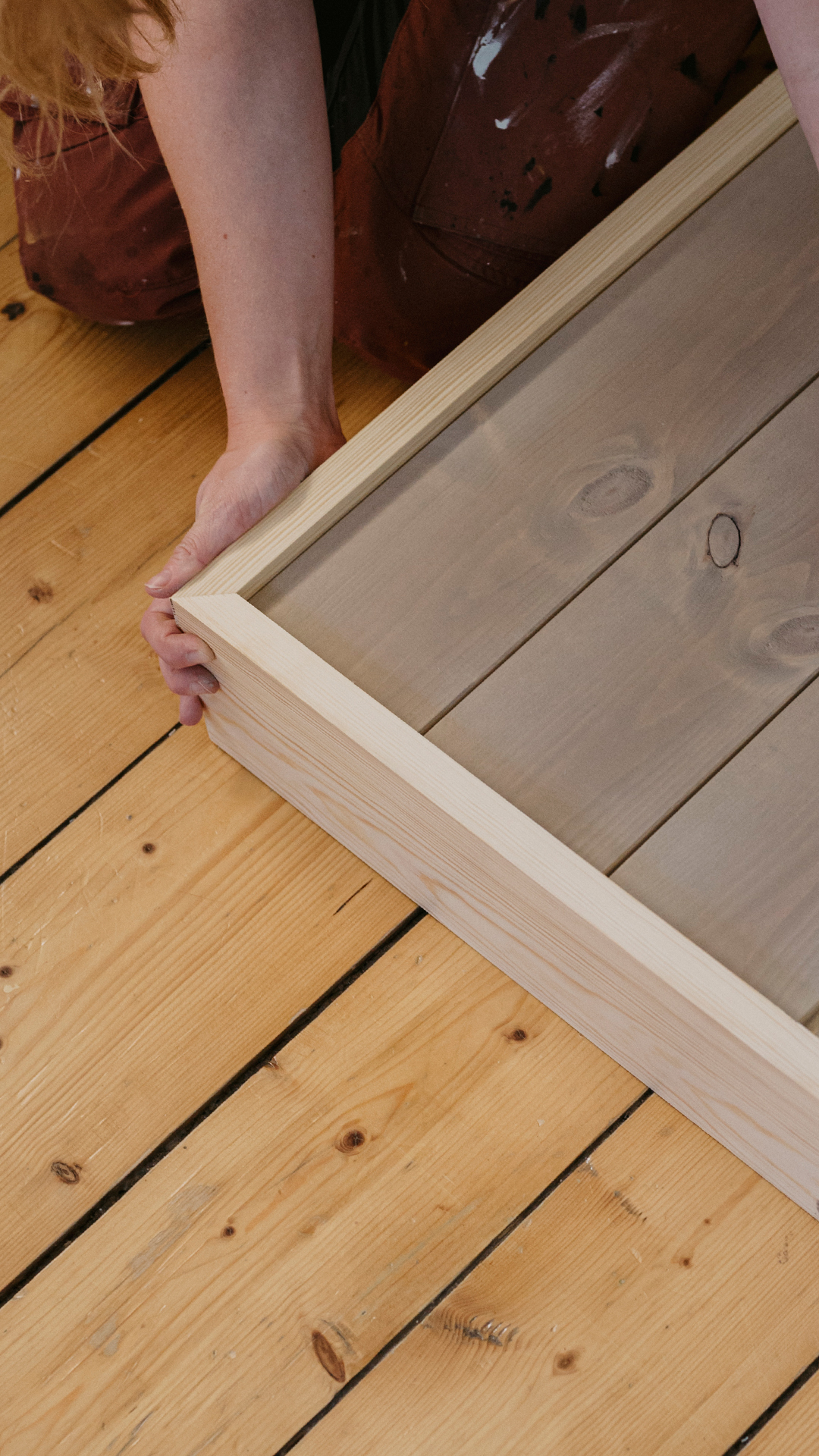 Kapa reglar, panel och lister av Planhyvlad furu till ramen. Evelina sågade ramens hörn i 45° för snygga övergångar.
