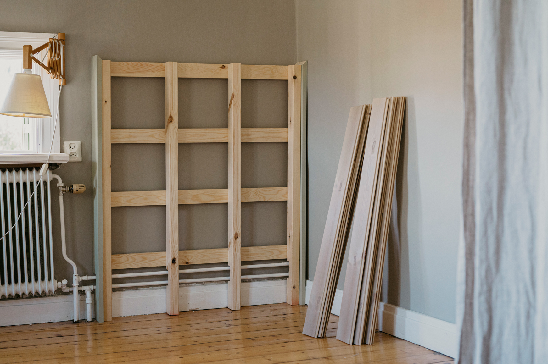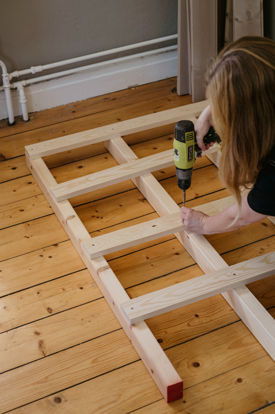 Skruva ihop reglarna till en ram direkt på golvet och lägg in tvärslåar för stabilitet. Förborra för att undvika sprickor.
