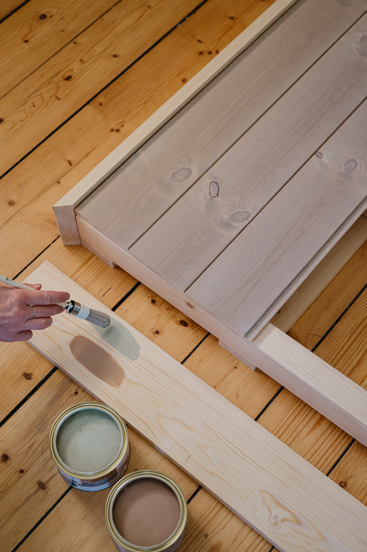 För att hitta rätt ton testade Evelina olika kulörer till Stilla Sandbeige. Hon fastnade till slut för den mjuka gröna S3010-G70Y, som sonen också ville ha. Ett enda lager färg lät träet lysa igenom och gav en naturlig känsla.