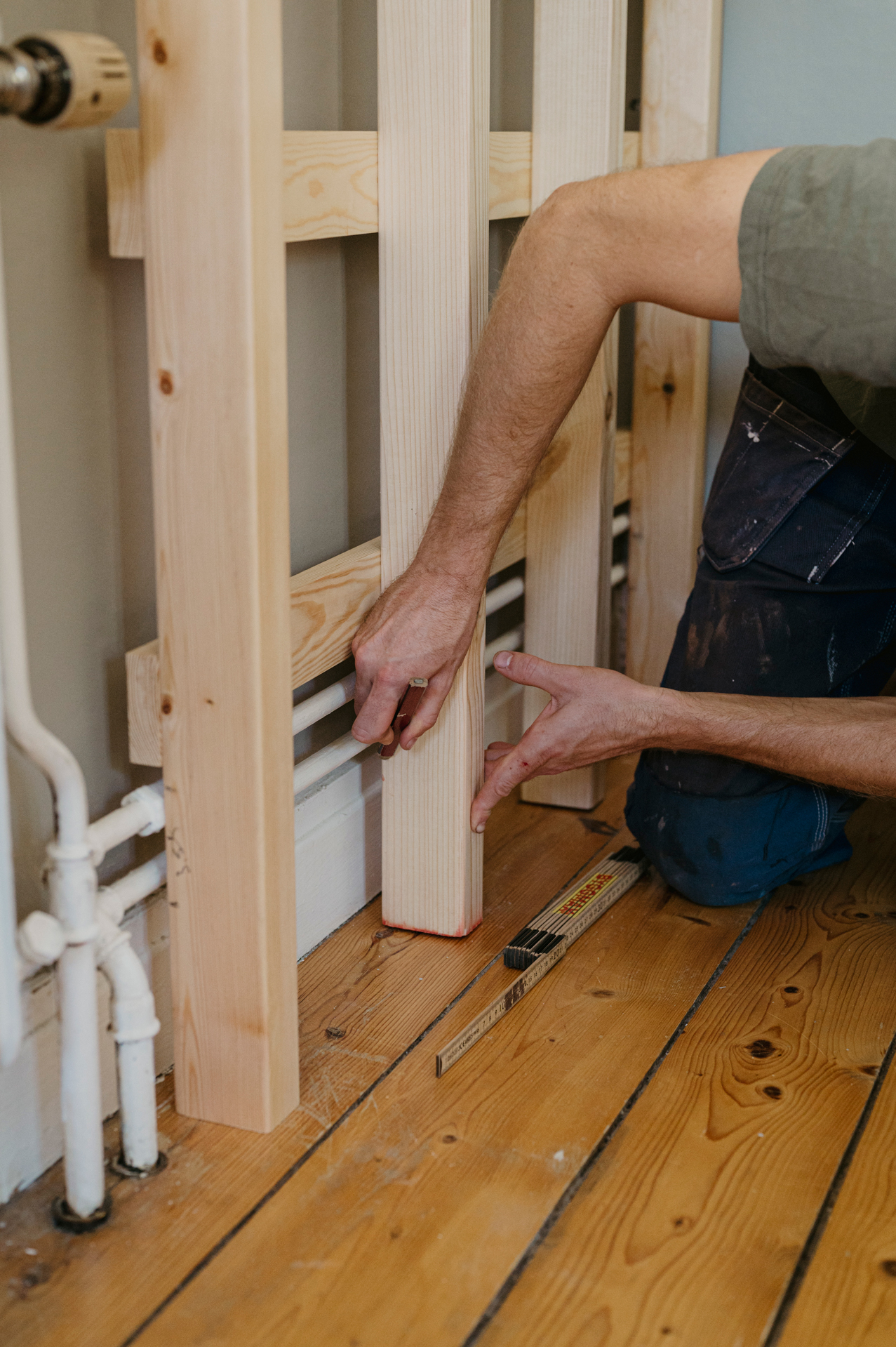 Rören längs väggen gjorde att sängen inte kunde stå dikt an. Evelinas man Sebastian löste det genom att såga ur nederdelen av stommen så att gaveln gick att skjuta hela vägen in.