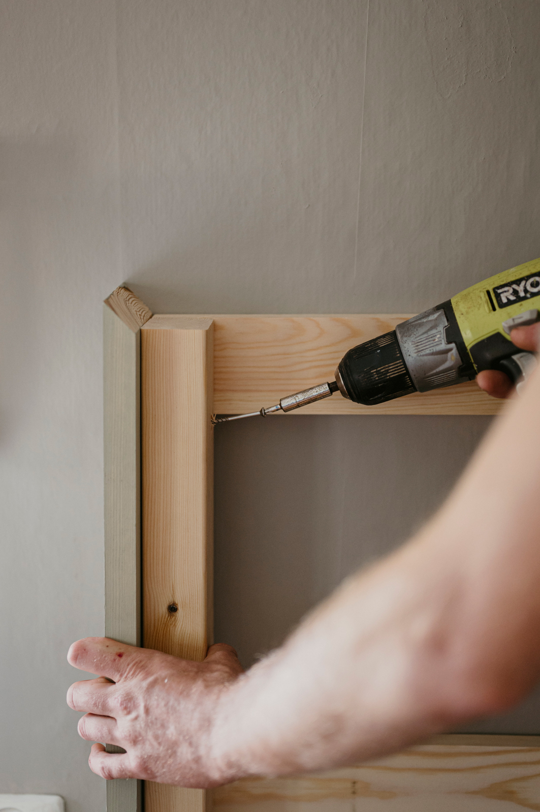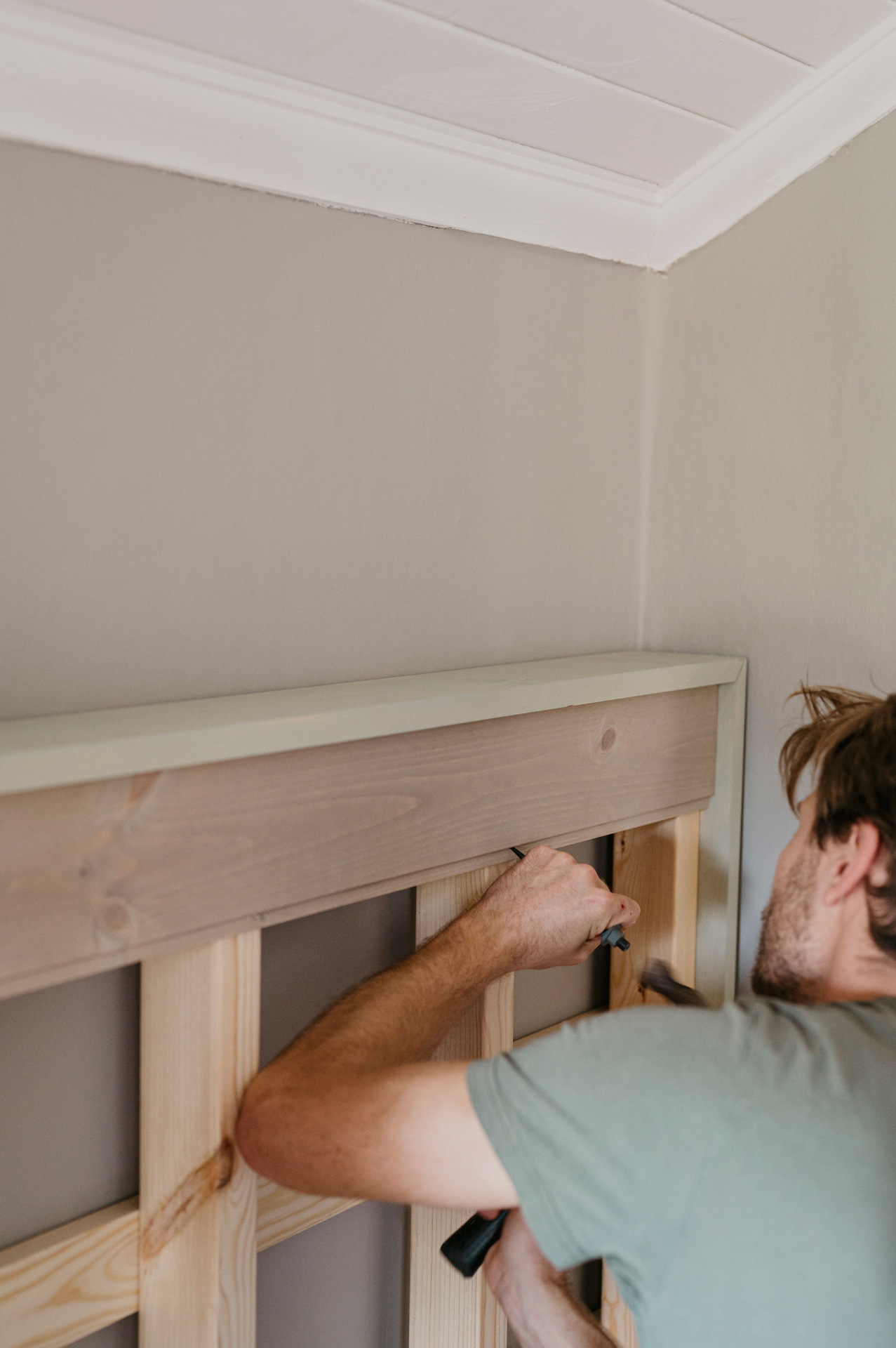 Fäst den målade ramlisten längs sidorna och upptill på stommen. Evelina skruvade från insidan för att dölja skruvarna och ge sänggaveln ett rent inttryck.