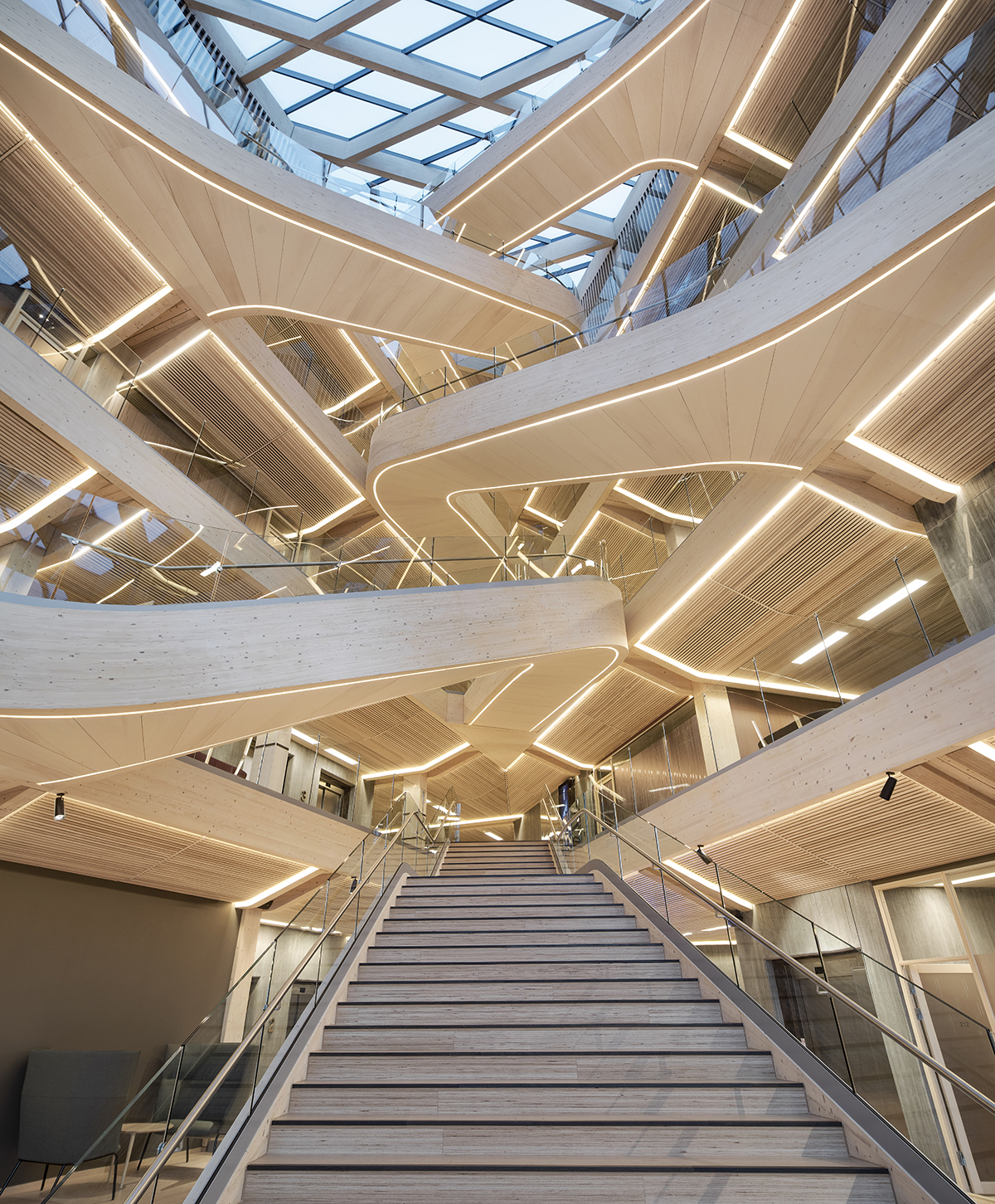 Finansparken är fylld med Moelvens produkter. Moelven Limtre har levererat den bärande träkonstruktionen, medan Moelven Modus har stått för ribbtak och inredningslösningar. Finansparken är ett av de största projekten som företagen har haft, med unika krav på möbelfinish på träet, arkitektur, byggtid och byggmetod.
