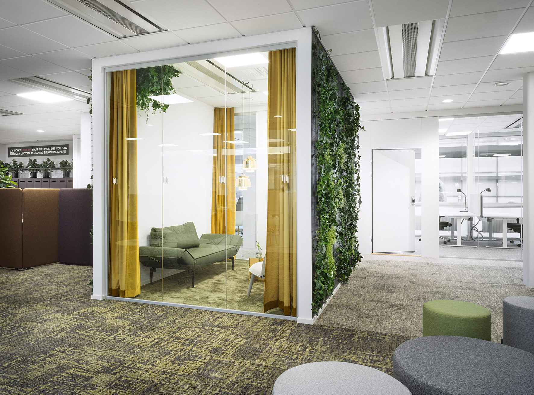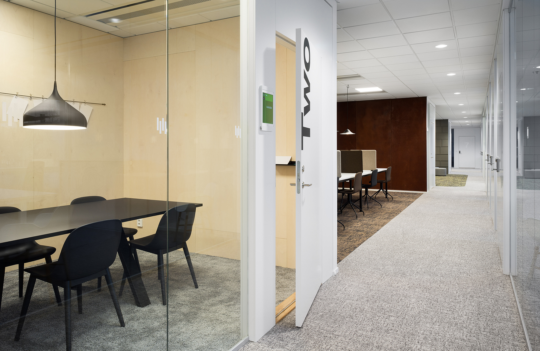 För att kunna erbjuda dessa valmöjligheter och för att skapa en designad och flexibel arbetsmiljö valdes hållbara systemlösningar från Moelven Modus. Glasade väggar ger en känsla av öppenhet samtidigt som det är avskärmat. För dörrmiljön valdes Portaler som skapar ett tydligt uttryck.