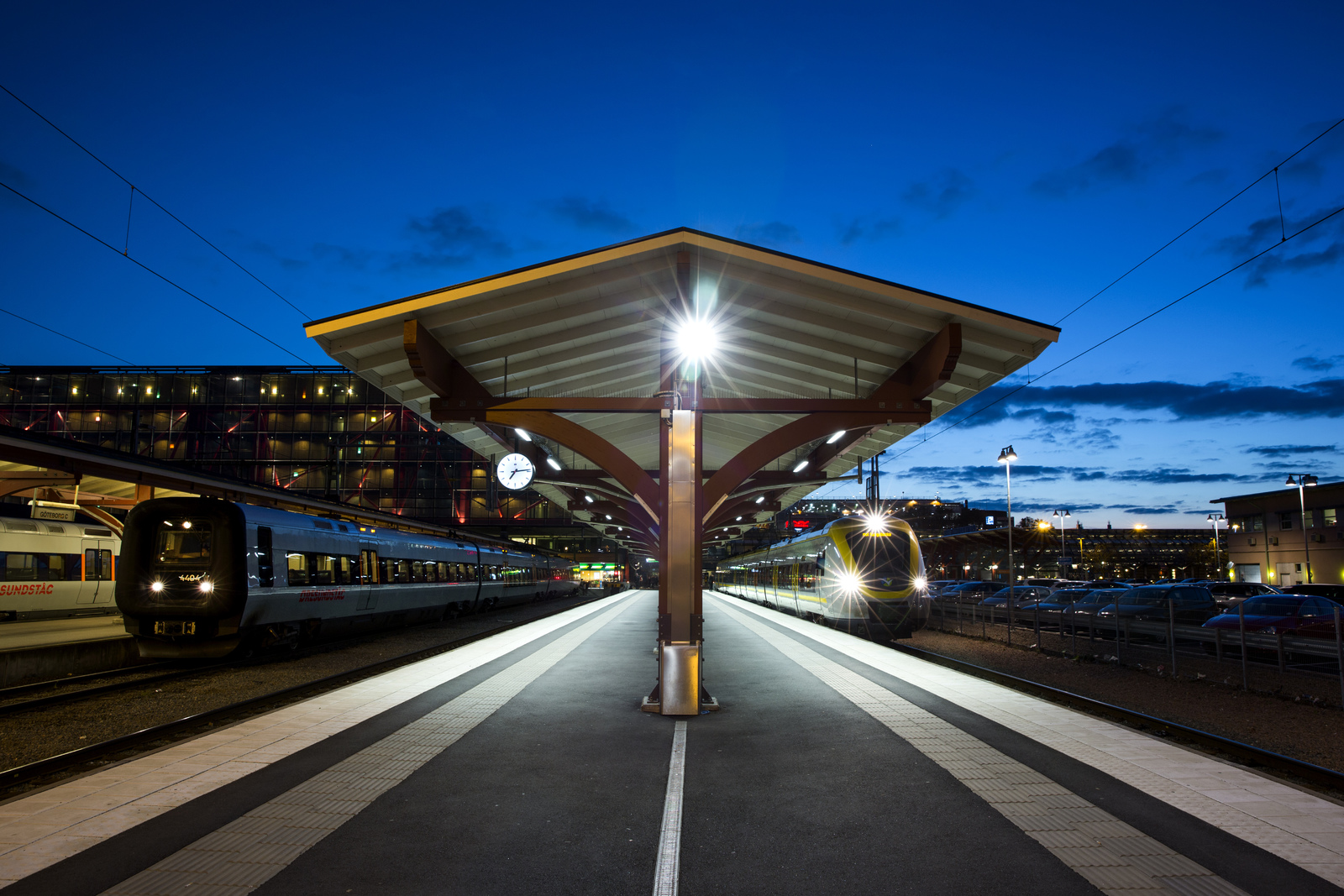 Perrongtaket er lever av Moelven Töreboda. Perrongtaket består av både bågar och rakt limträ.