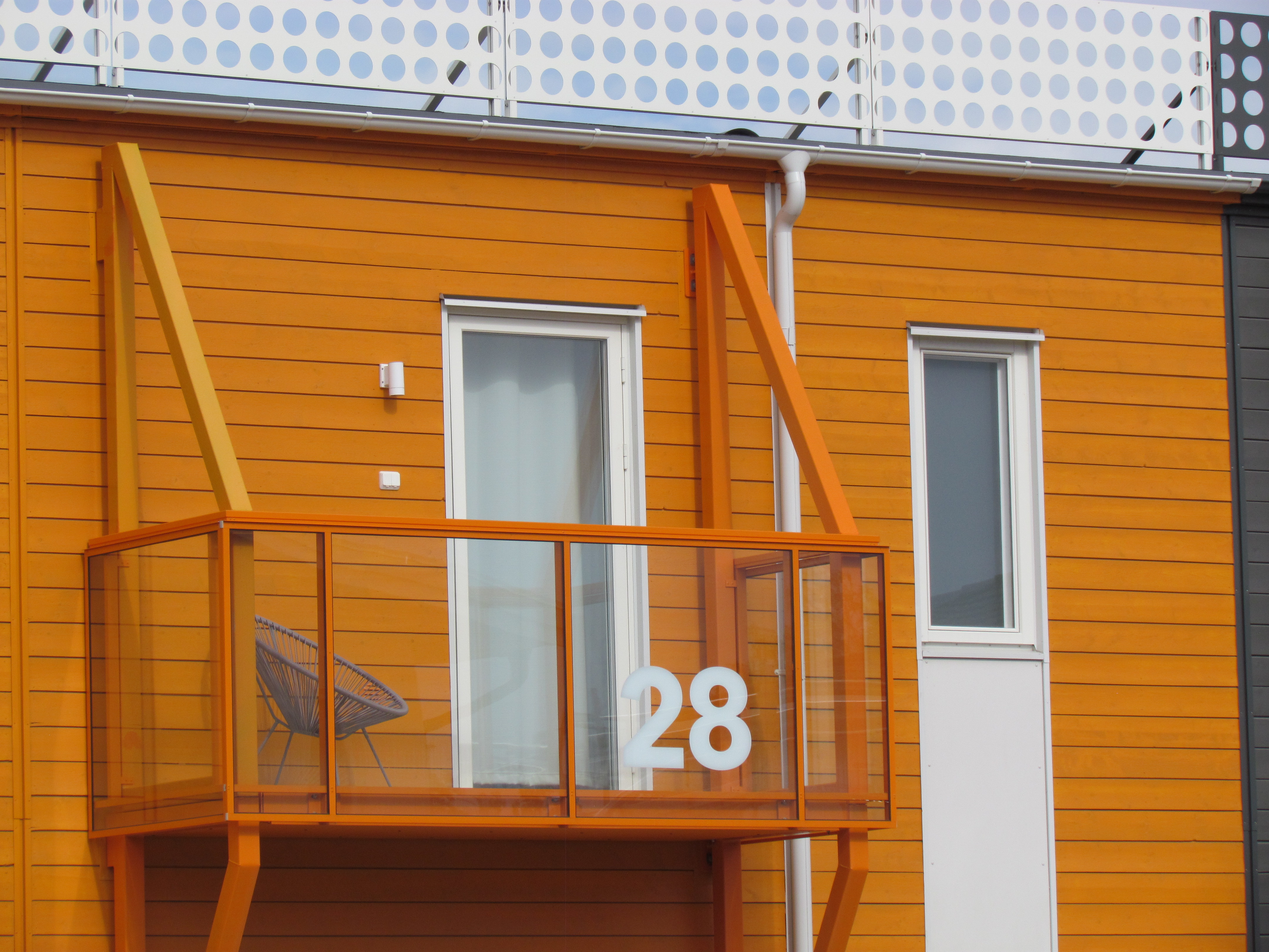 Byggnader med ett modernt och futuristiskt formspråk i färgstarka kulörer. Det arkitektoriska uttrycket förstärks genom designade smidesbalkonger samt taksarg och fasadutsmyckning av hålad dekorplåt.