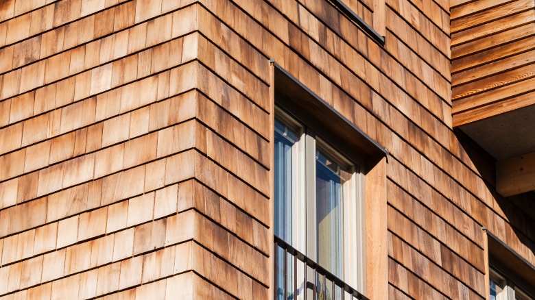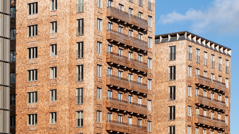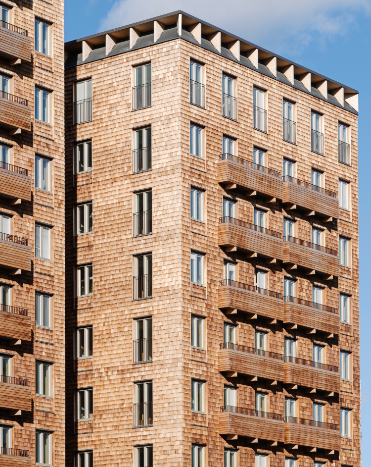 Valet av cederspån blev ett självklart val då det är en underhållsfri fasad som även är brandtestad, samt rimmar väl med tanken om en stenstadsarkitektur eftersom det på håll kan liknas vid tegel