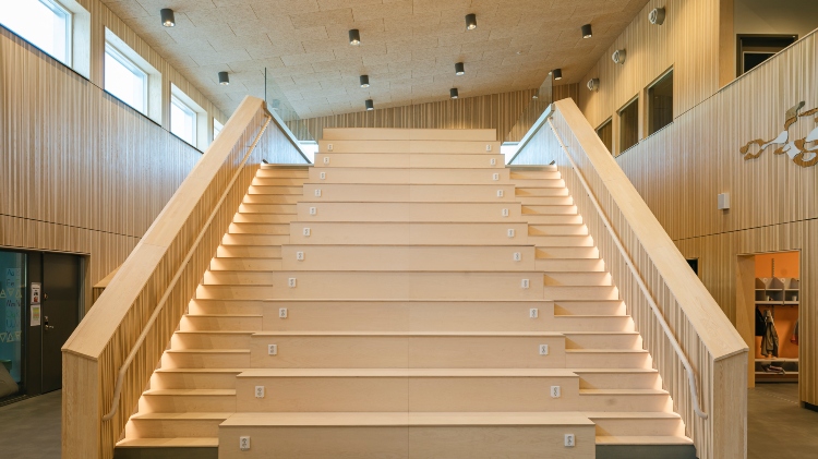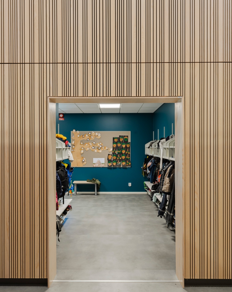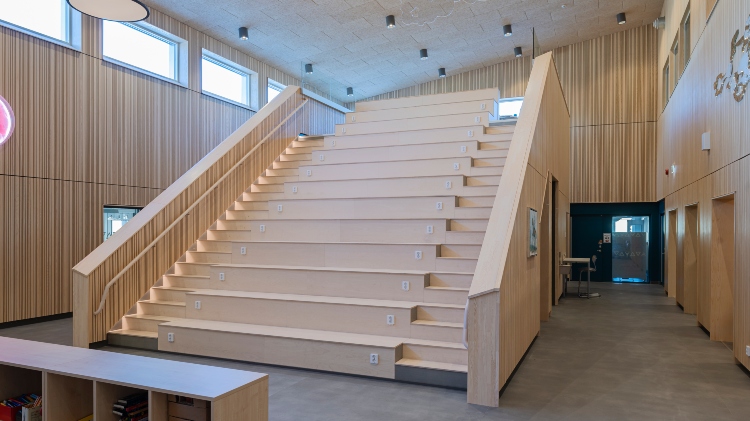 Moelven Studio Stripe Ask i utförandet Random design smyckar väggarna i den nya skolan JKC i Jämjö. Ribborna har varierande bredd och ger rummen ett lekfullt uttryck och bidrar till bra akustik. Även Moelven Studiopanel Ask med sina släta skivor pryder utvalda delar för att fullända det visuella.