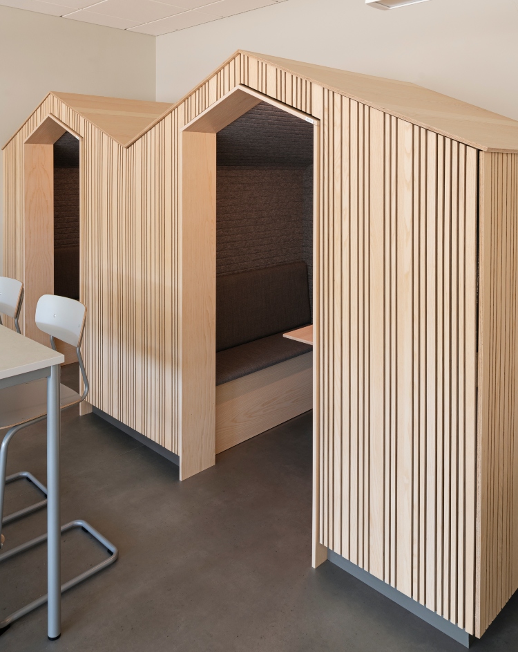 Studiebåsen har man valt att klä in med Moelven Studio Stripe, en panel som är enkel att såga till och anpassa till unika format.