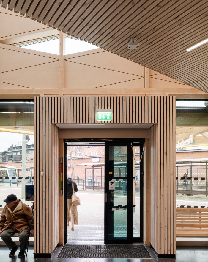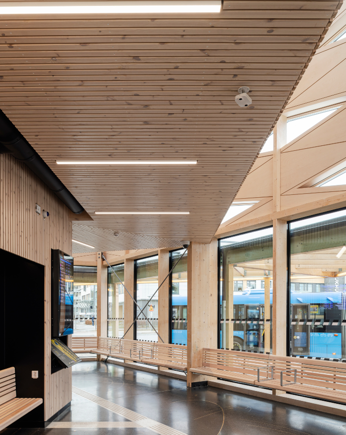 Västtrafik har byggt ett nytt resecentrum i Angered. Wingårdhs Arkitekter har ritat och det är uppfört enligt höga miljökrav. Vi har levererat interiöra brandskyddade paneler, både ribbor och plywood.