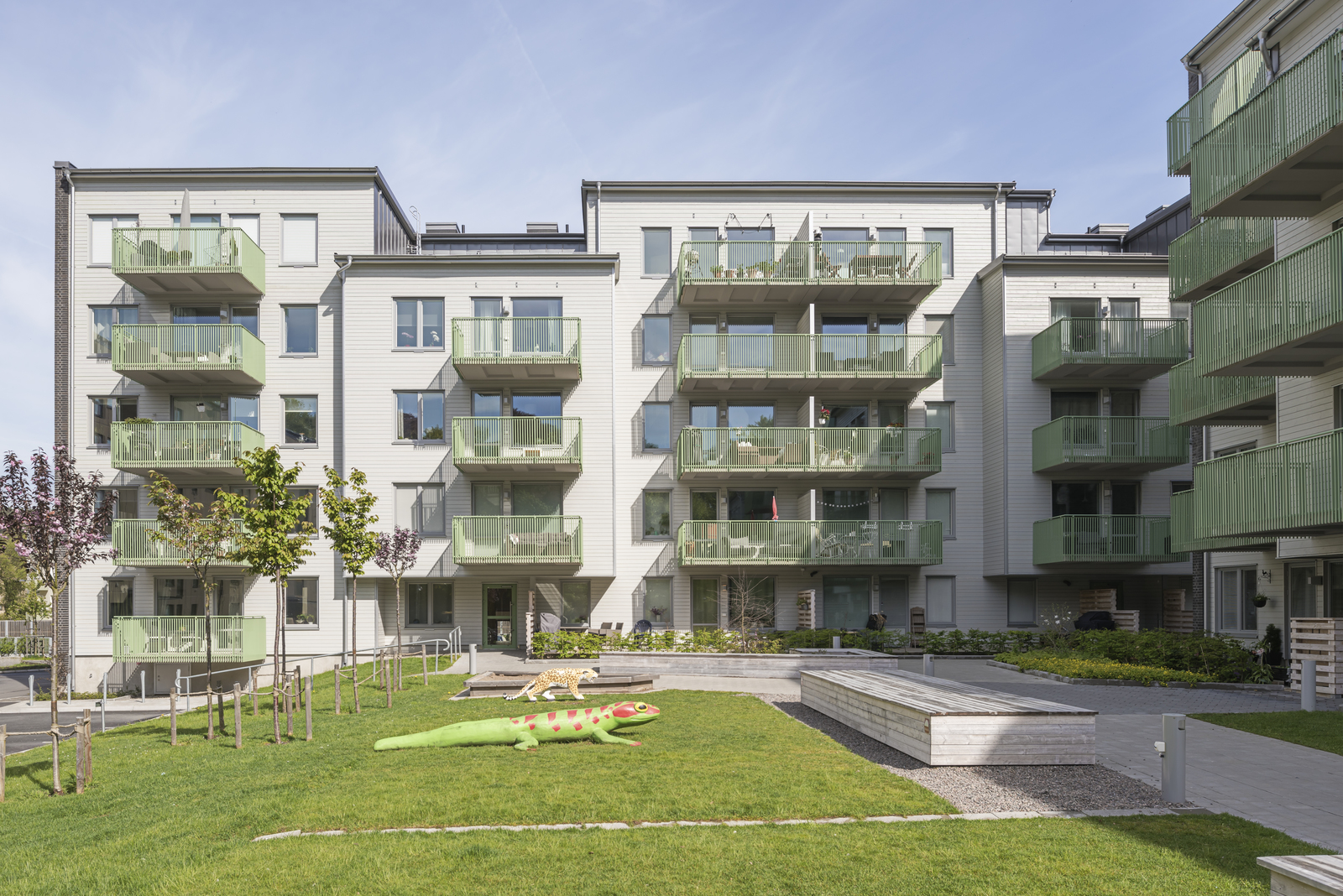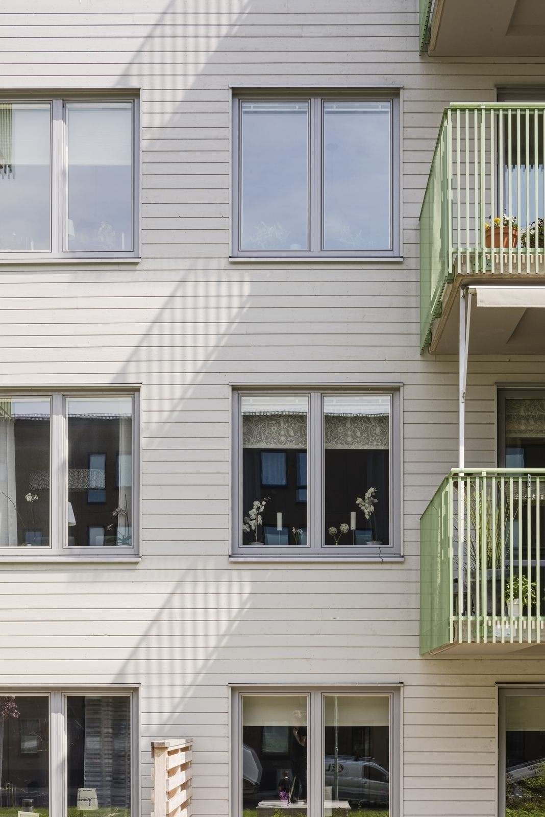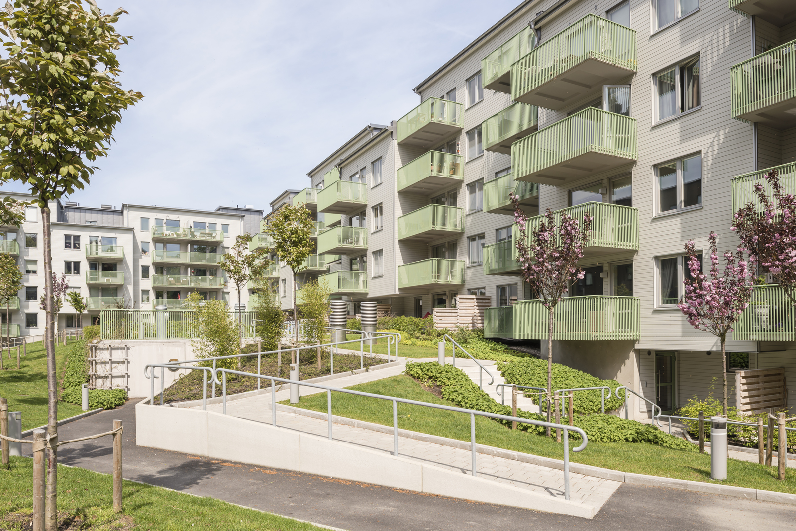 Träfasadernas ljusa kulör tillsammans med de gröna räckesdetaljerna ger ett lugnt intryck men samtidigt känslan av ett nyskapande byggnadsuttryck.
