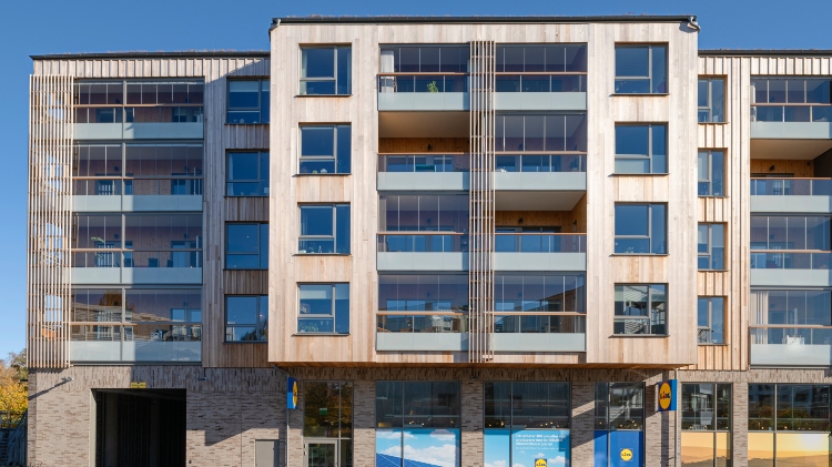 Bontop Mölnlycke är ett 55+ boende strax utanför Göteborg. Fasaderna täcks till största delen av cederträ från Moelven i olika profiler och dimensioner. Fasadsystemet är brandskyddat enligt SP Fire 105. Panelen har varit monterad i ett år och har börjat patineras.