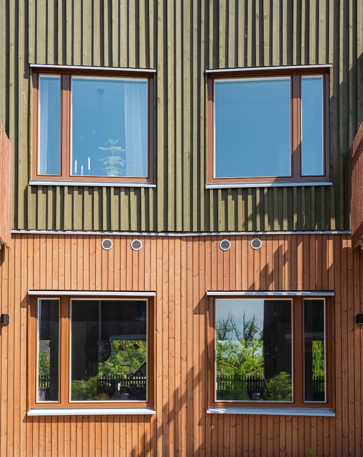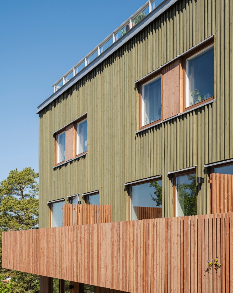 Fasaderna är bruna och gröna för att smälta in fint i naturen och bland trädkronorna. Samtidigt som träfasaderna signalerar samhörighet med Trosas traditionella trähusbebyggelse, har de en mer organisk design som ger en modern och nutida tolkning, säger Jacob Haas, ansvarig arkitekt.