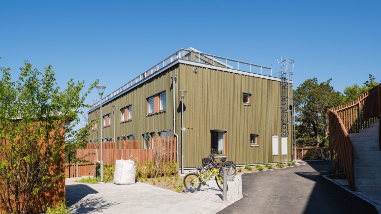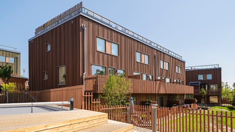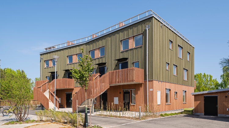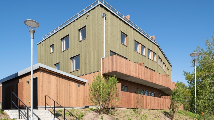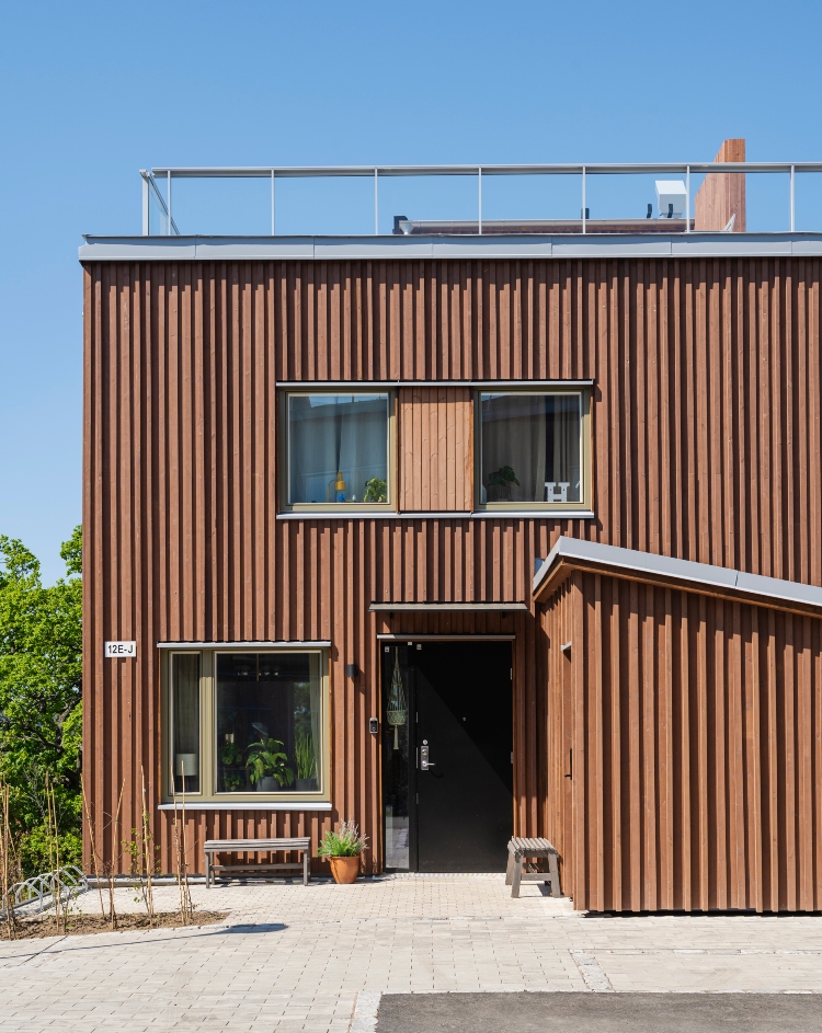 På Brf Sjöutsikten i Trosa är fasaderna klädda med brandimpregnerad och pigmenterad ThermoWood. BT Pigment i kulörerna i Grönt, Svagt brun och Varmbrun skapar kontraster och smälter samtidigt in i omgivningen. De olika profilerna och vertikala ribbor i blandade dimensioner ger fasaden extra karaktär.