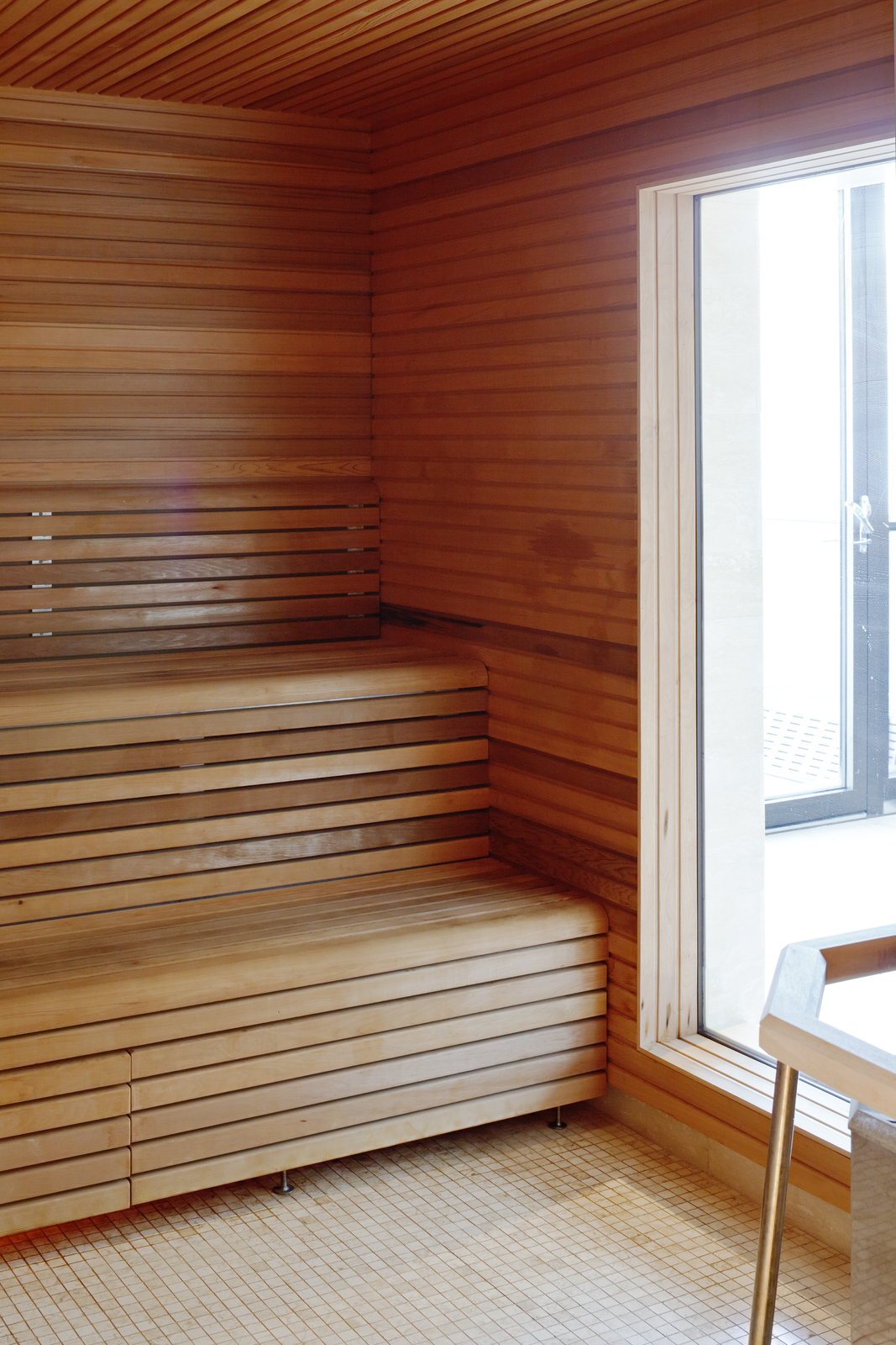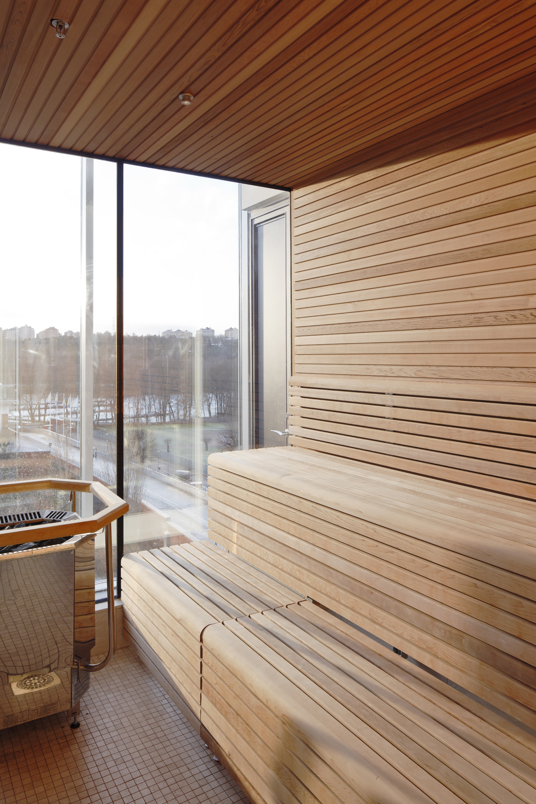 Till bastun på Elements Spa, Clarion Hotell Stockholm, valdes ceder som panel och lav.