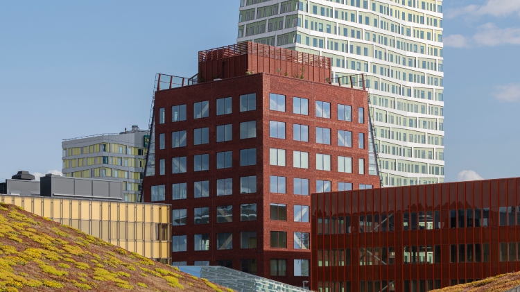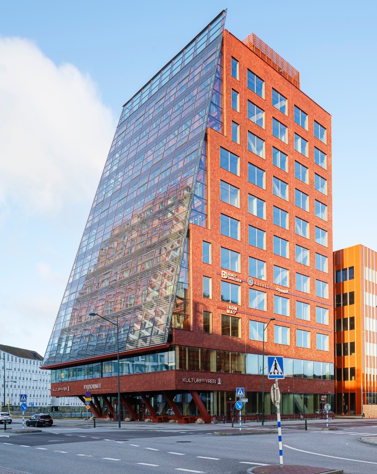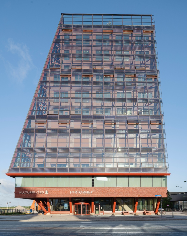 Sveriges högsta kontorshus i trä, Fyrtornet, ligger i Malmö. Fasaden är klädd med brandimpregnerade och infärgade cederträspån från Moelven. Med Cederträspån BT Infärgning Röd blir byggnaden ett naturligt, varmt inslag i omgivningen. Spånen tillsammans med brandimpregnerad plywood från Moelven Vänerply uppfyller brandprovet SP Fire 105.