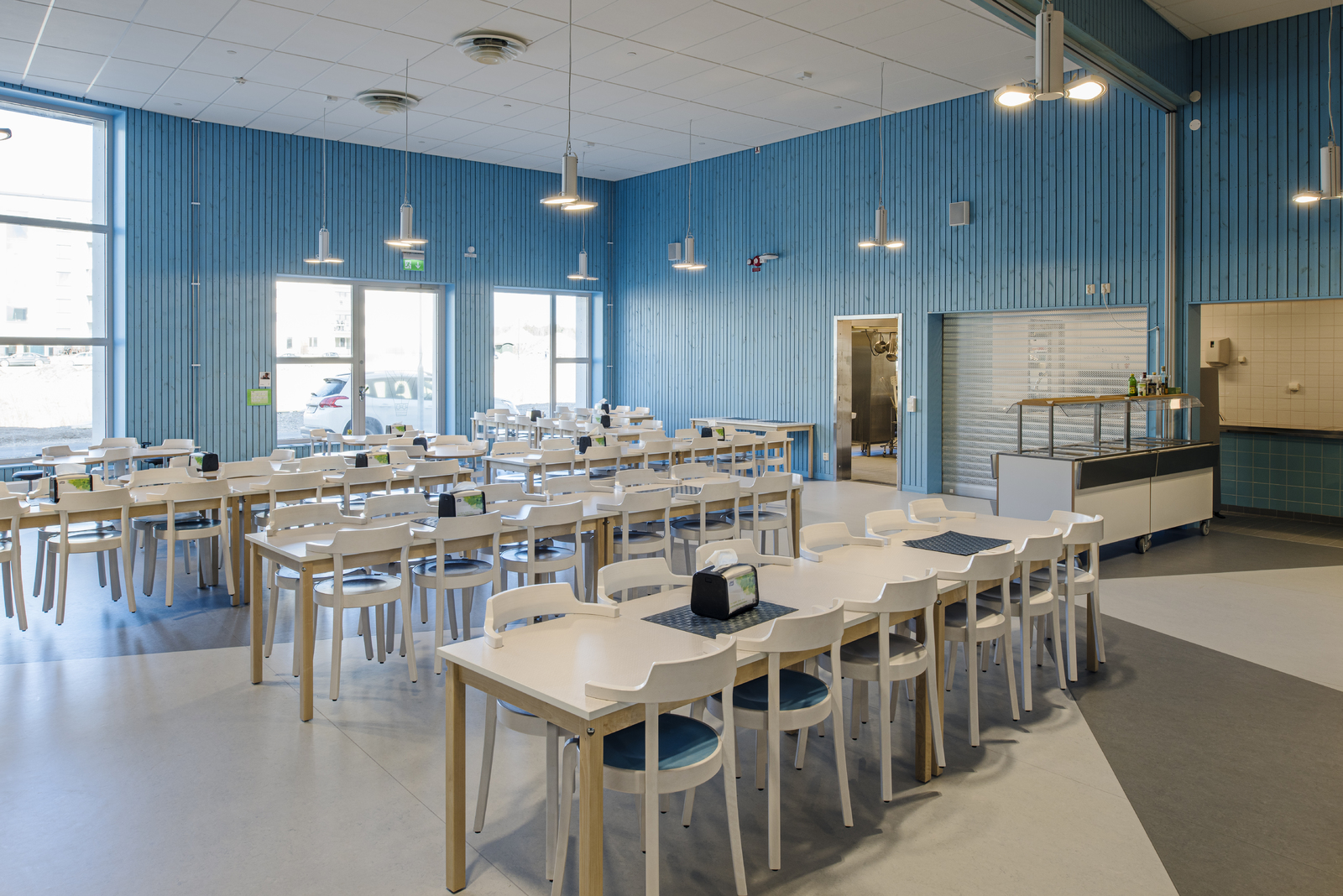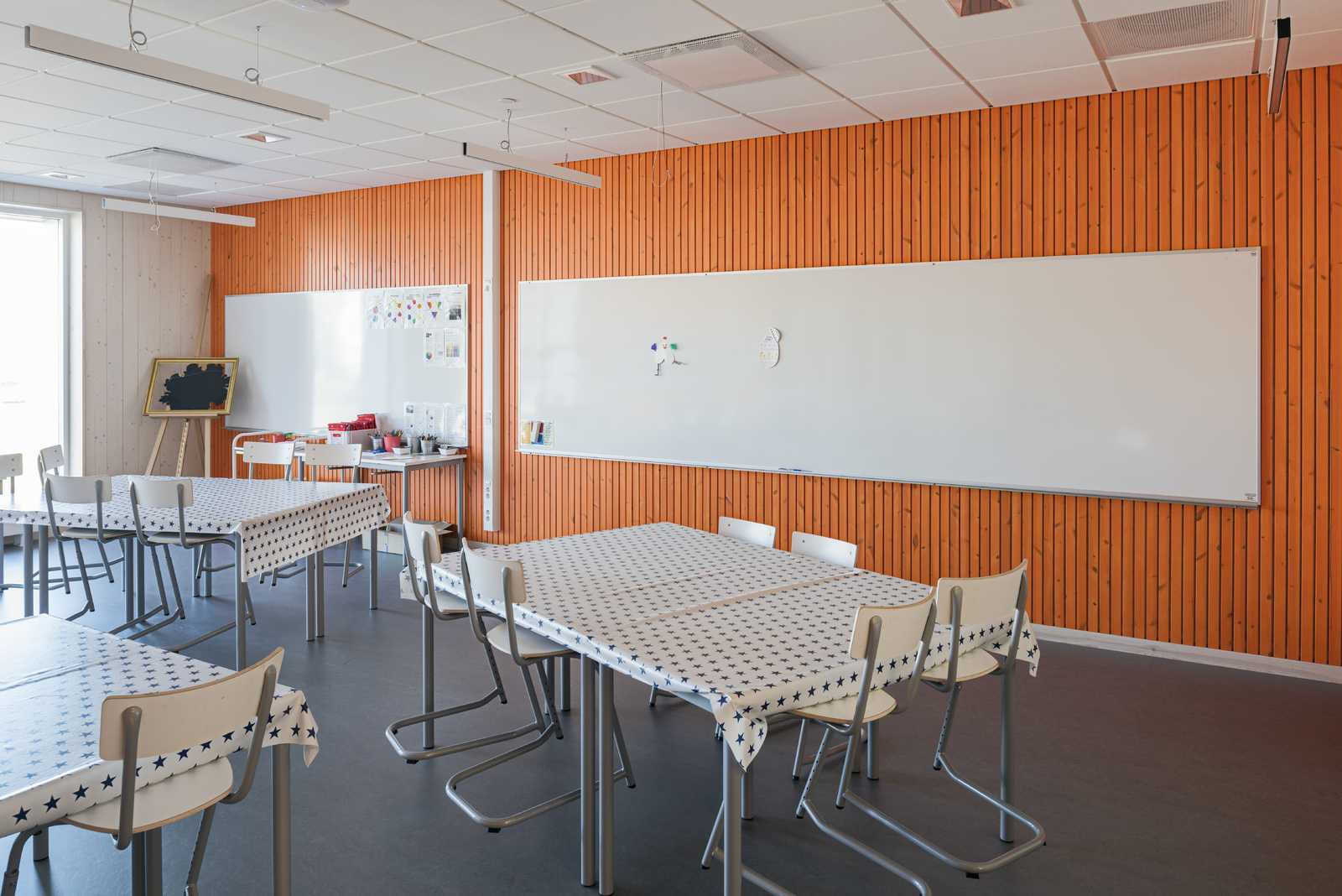 Trä som materialval skapar en lugn miljö för de 300 elever i årskurserna F-5 och 100 förskolebarn som skolan har plats för.