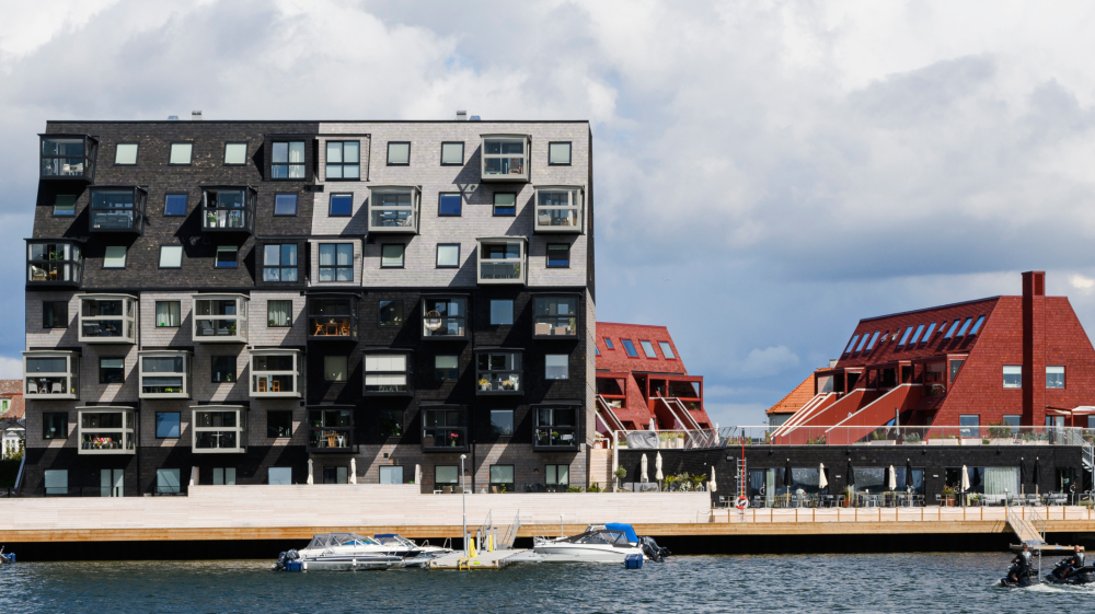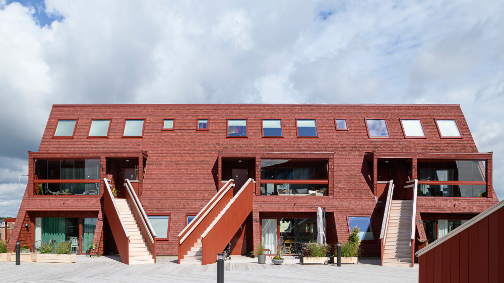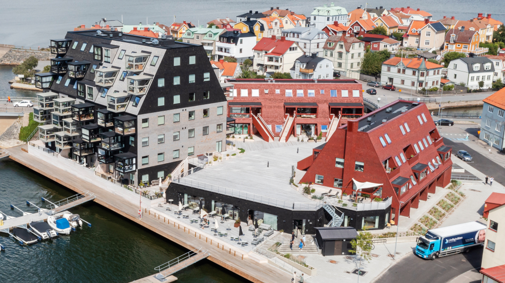 Unikt trähusprojekt längs kajkanten i Karlskrona, eller som Svenskt Trä skriver "En ny silhuett i världsarvet Karlskrona". Två huskroppar med brandskyddad röd cederträspån och en huskropp med brandskyddad cederträspån i kulör svart och silver. Cederträspån-panelen är testad och godkänd enligt SP Fire 105 med bakomliggande brandskyddad plywood som är lokalt producerad av Moelven Vänerply.