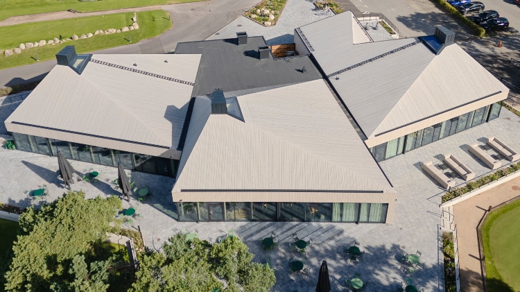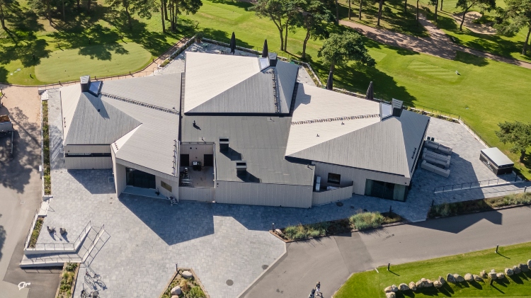 Med samma material på fasad och tak förstärks den spännande arkitekturen på Kristianstad Golfklubb. Den värmebehandlade panelen ThermoWood Premiumolja Patinagrå ger byggnaden ett förpatinerat utseende redan från start och med tiden kommer den naturliga patineringen ta över.
