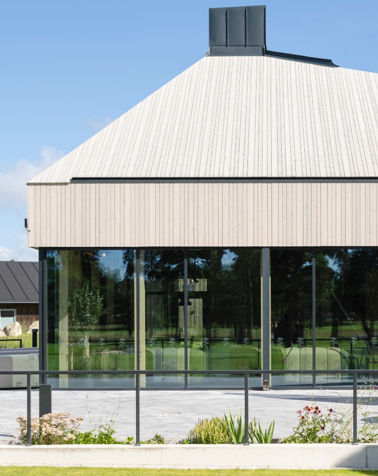 Här möter sanddynerna den vackra tallskogen och den nya byggnadens design tar tydligt avstamp i den unika platsen. Byggnaden signalerar öppenhet och rymd och skapar utblick i alla riktningar mot golfbanan och dess terrasser där eldstäder möjliggör uteliv året om. En av utmaningarna i projektet var att byggnaden inte har någon baksida, utifrån den utgångspunkten har tre lika volymer skapats och pusslats samman, roterade efter väderstreck för att optimera ljusspelet kring volymerna som bildas och låta helheten spegla pinade sanddynor säger Jerker Edfast, Ansvarig arkitekt för byggnaden. Både exteriören och interiören speglas av naturmaterial och dess naturliga elegans tillsammans med hög detaljering och fingertoppskänsla kring att skapa en unik miljö med känslan av att känna in platsen och dess naturliga egenskaper. De ståtliga eldstäderna skapar rumslighet i de höga volymerna där man gärna lyfter blicken mot fantastiska takljus som öppnar sig mot himmeln. Huvudnumret får nog ändå tilldelas kombinationen av allt fantastiskt trä tillsammans med baren gjord i lokal svart diabas säger Olivia Johansson, Ansvarig arkitekt för konceptet kring materialval och interiören.