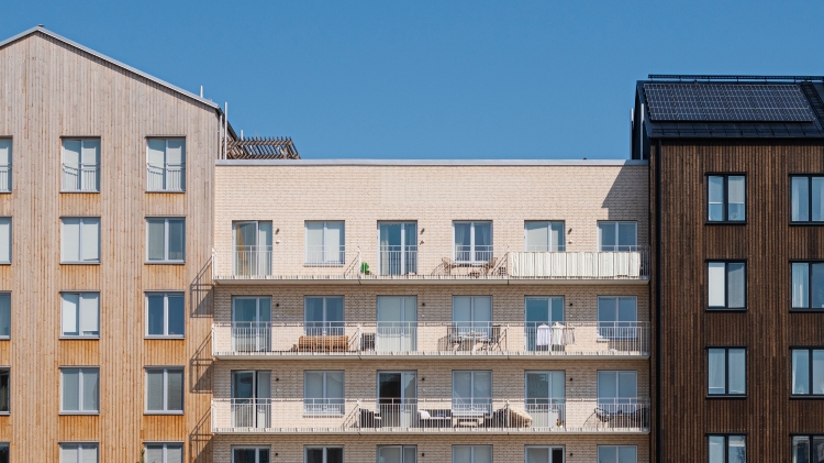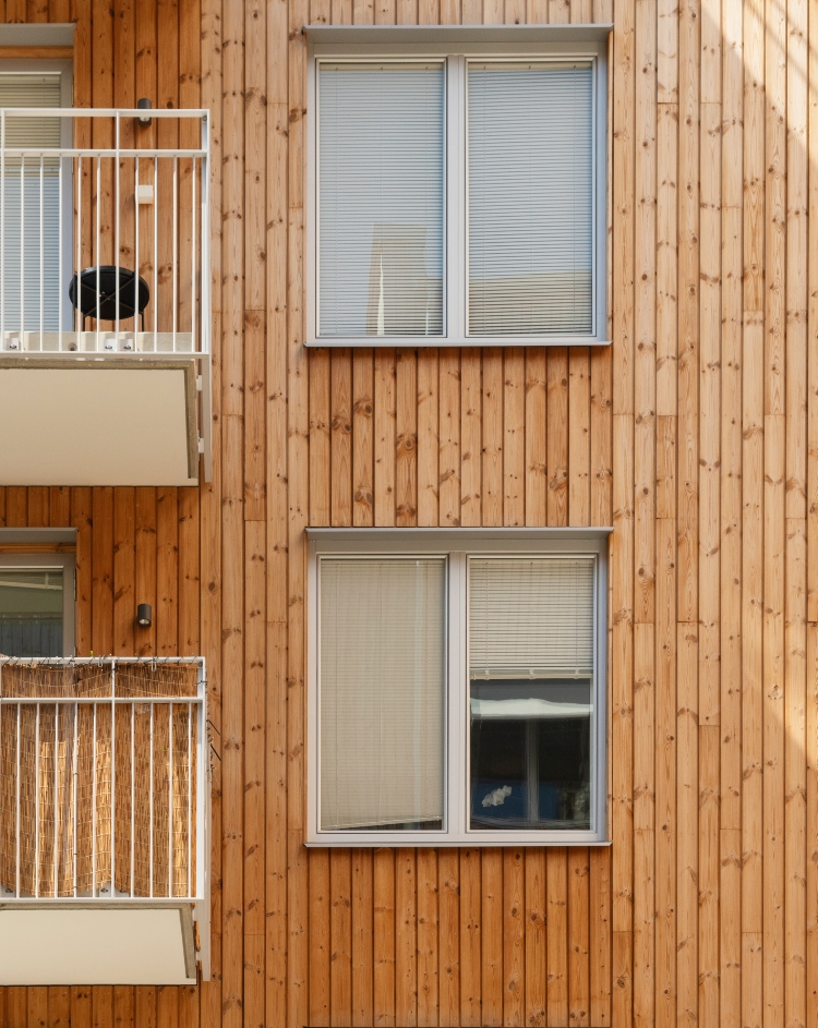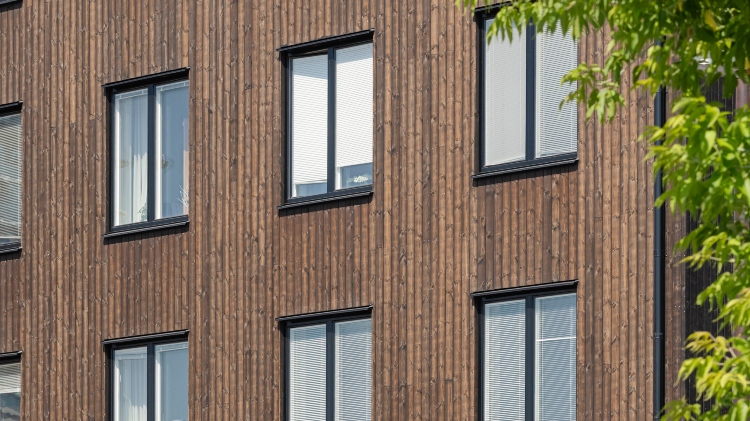 För att skapa liv i fasaderna kan flera olika kulörer kombineras. I Kv Alen har både naturlig och pigmenterad ThermoWood använts för att ge kvarteret en mer ombonad känsla. Med hjälp av de olika kulörerna förstärks känslan av flera olika byggnader istället för en.
