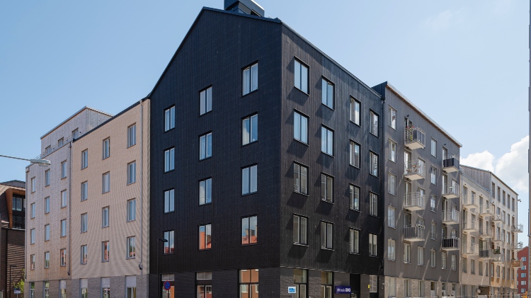 I det nya området Norrtälje hamn ligger Kv Alen. Fasaderna smyckas av både naturlig och pigmenterad ThermoWood i standardkulörerna Svart och Patinagrå. Panelen är dessutom brandskyddad enligt SP Fire 105.