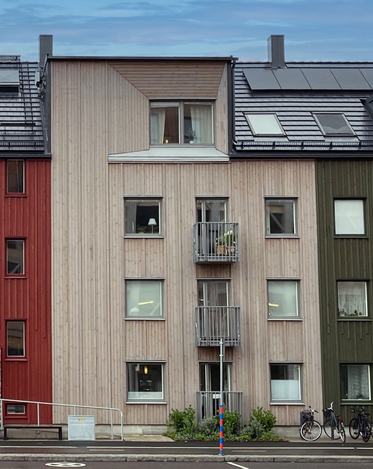 BT Pigment löser utmaningen med de brandkrav som ställs på fyrvåningshus samtidigt som arkitektens visuella önskemål kan tillgodoses. De fyra kulörerna förstärker känslan av stadsvillakvarter med flera avgränsade husdelar. BT Pigment Silver och Röd är standardkulörer medan kulörerna Grön och Naturbrun är arkitektbeställda.