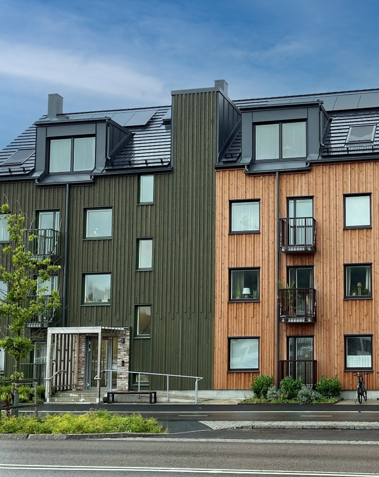 Kv Navaren är beläget i det nybyggda området Pedagogen Park i Mölndal. Ett mysigt stadsvillakvarter där fasaderna av värmebehandlad furu med BT Pigment i fyra kulörer naturligt smälter in i omgivningen. Panelen uppfyller brandprovet SP Fire 105. Vertikala ribbor på panelen ger extra liv åt fasaden.