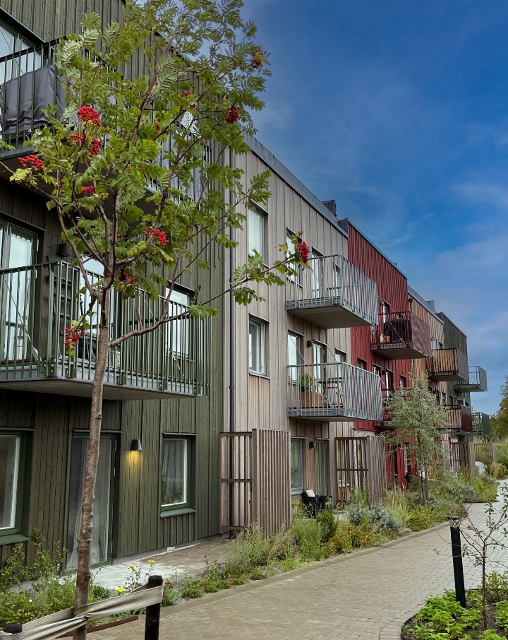 Kv Navaren blev väldigt bra, inte minst fasaden i förpigmenterad och brandimpregnerad värmebehandlad furu från Moelven. Vi är jättenöjda med uttrycket och kulörerna (den gröna tog vi fram speciellt för projektet). Trä skapar trivsel i stadsmiljön, och det är jättekul att kunna skapa ett flerbostadshus som man verkligen vill vara nära!