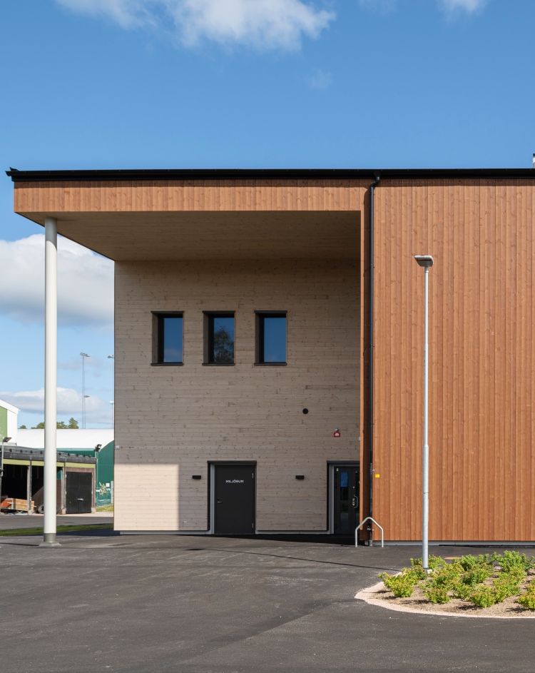 Fasaden är utförd i infärgad, värmebehandlad träpanel som med tiden kommer att bli ännu mer livfull och uttrycksfull