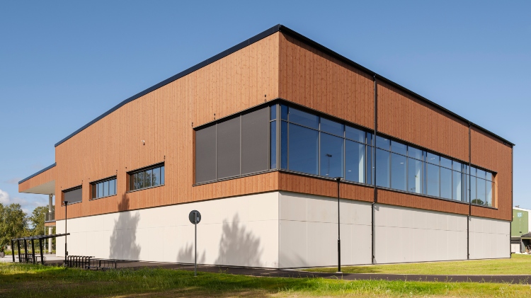 Med ThermoWood BT Pigment i kulörerna Mahogny brun och Vit har Malung Simhall ett naturligt varmt uttryck. Genom att kombinera ThermoWood i två olika profiler har arkitekten skapat känslan av en extra bred panel som samtidigt är intressant på nära håll. Fasaderna är brandskyddade enligt SP FIRE 105 med bruksklass EN16755.