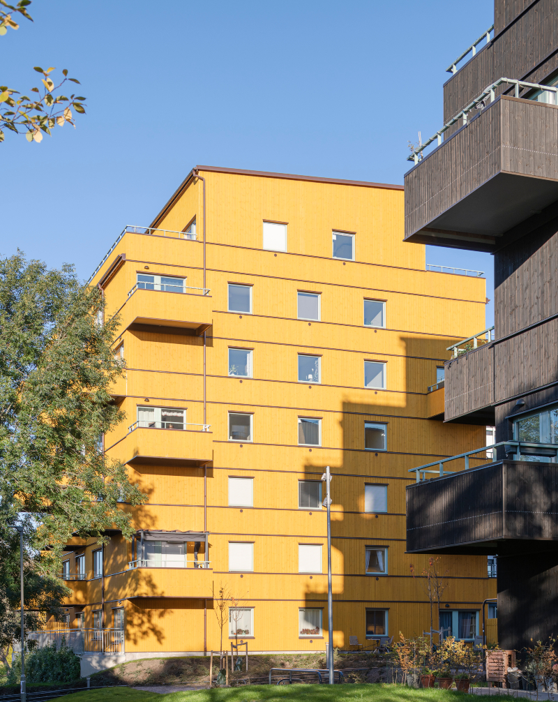 Brandklassad värmebehandlad furu i tre olika kulörer - gul, brun och svart. Husen varierar mellan 4 och 7 våningar och samtliga byggnader är brandklassade enligt SP Fire 105. Nacka kommun har prisat projektet och Aros Bostadsutveckling för hållbar stadsutveckling.
