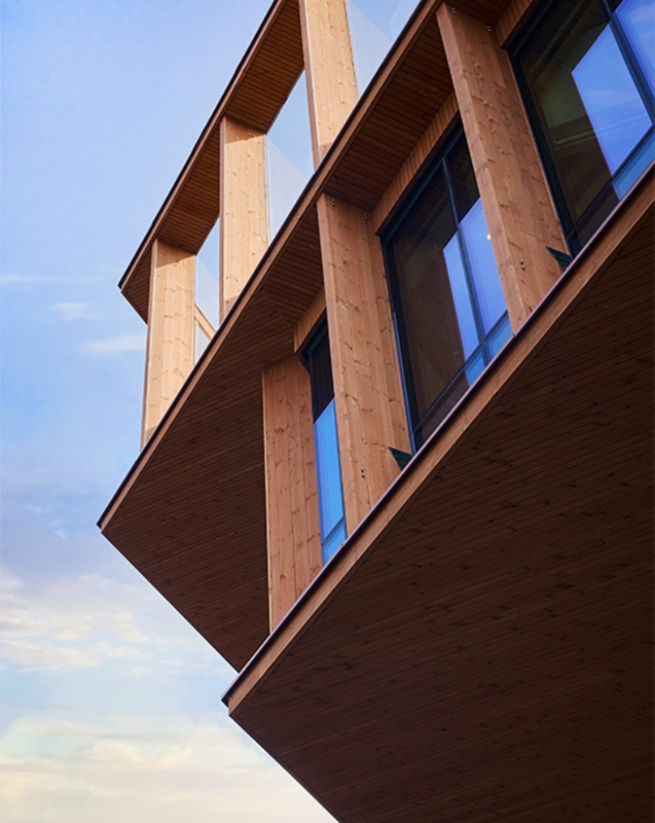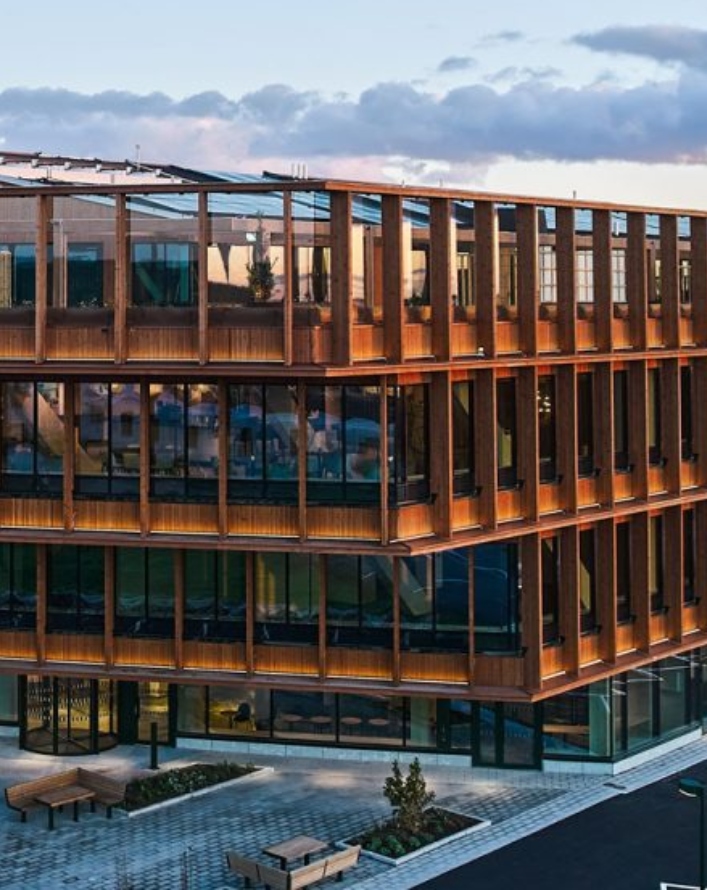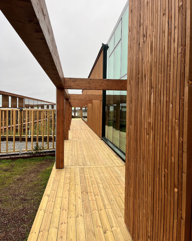 Viared Center i Borås är byggt med stort fokus på hållbarhet och miljö. Fasaden som består av brunbetsad Kärnfuru i olika profiler och dimensioner. Tillsammans med limträ ger det ett naturligt utseende som bidrar till att skapa en social mötesplats för återhämtning.