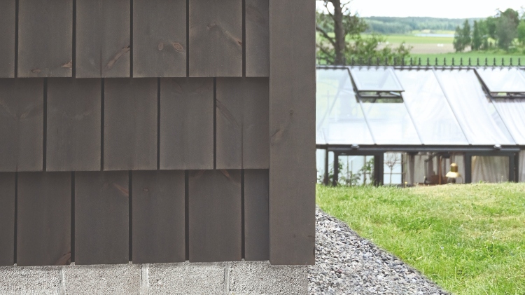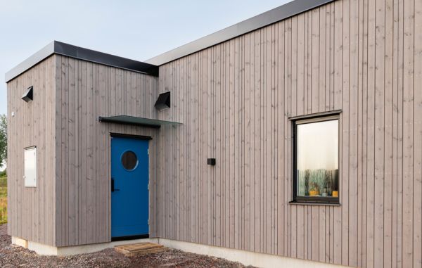 Kärnfuruspån skapar en naturlig träfasad där spånens form ger ett spännande uttryck.